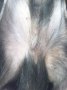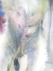 治療始めて2ヶ月経過、 ほとんど痒がらなくなり、 腹部の皮膚の肥厚も薄くなり、色素沈着もかなり改善されて来ました。部分的ではあるけど、腹部も発毛してきました。 8月14日初診時と比較すると一目瞭然