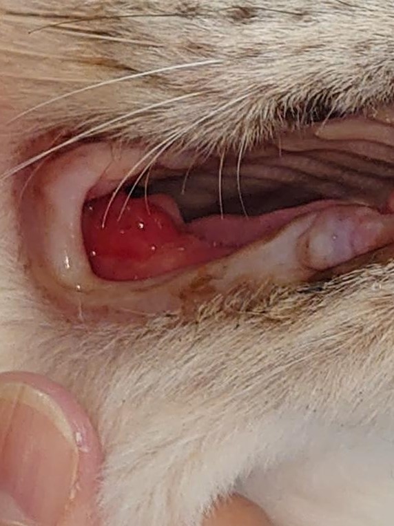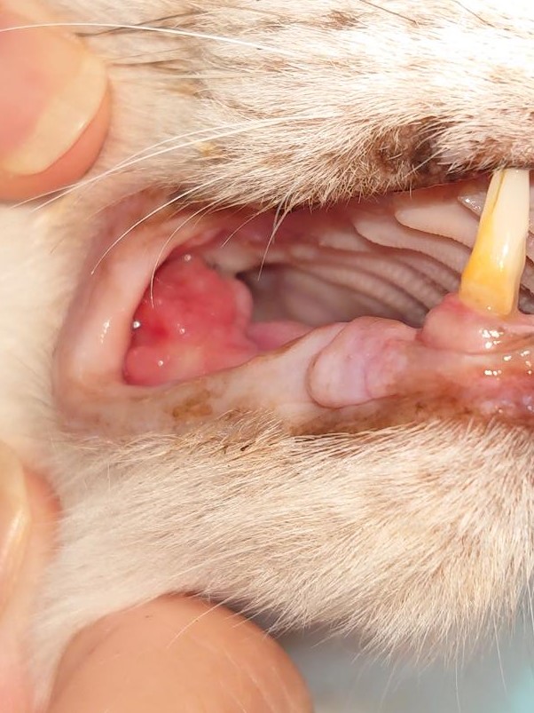 腫瘍は2週間前(下の写真2023,7,6)よりは正常部とガン組織との境界線がより鮮明になって識別ができやすくなってきている。歯茎もはっきりと見えてきた。