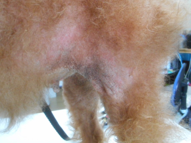脱毛、裂毛、皮膚肥厚、色素沈着などの慢性病変と、体全体に赤い発疹と皮膚の腫れの急性病変が同居する。