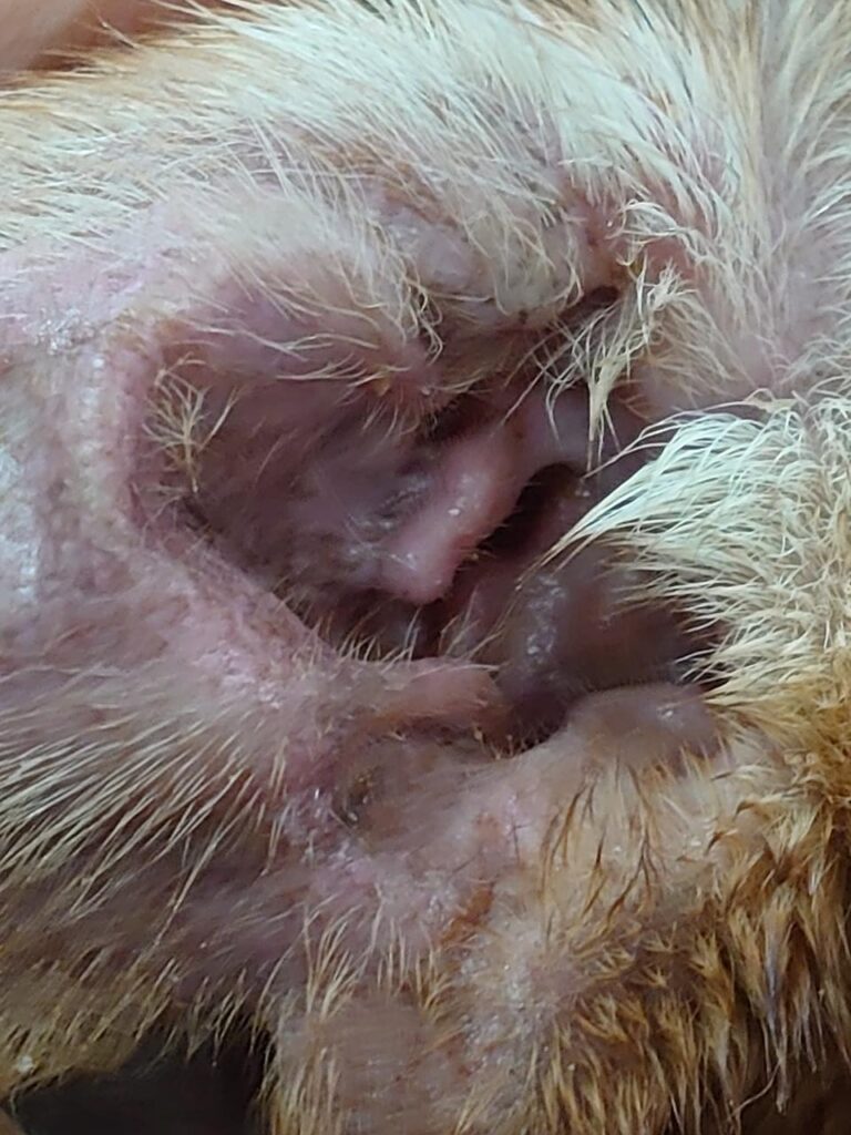 外耳道入口付近 ・・・ 腫れてジュクジュクしている。