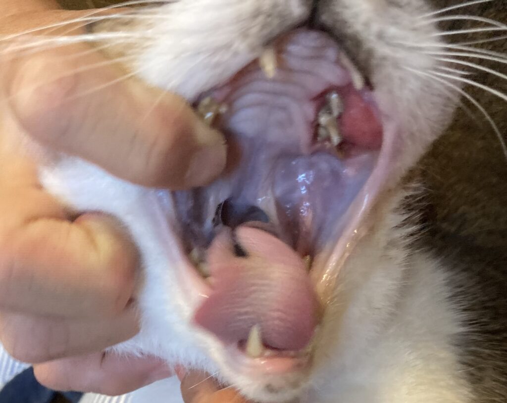 歯もぐらついていて、特に中央部の歯が問題で、食べるにも飲み込むにも食べ物が触れると痛いと思います。