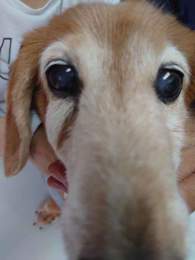 下と比較すると腫瘍が右目を下から押し上げて、右目が小さくなっている。。