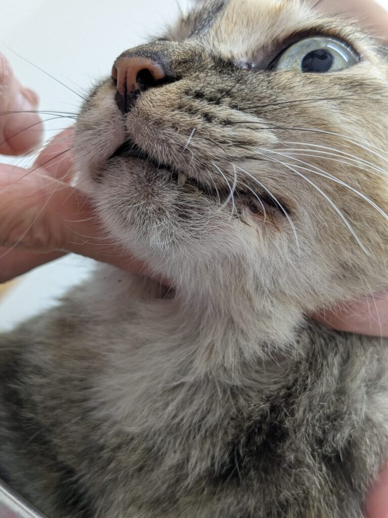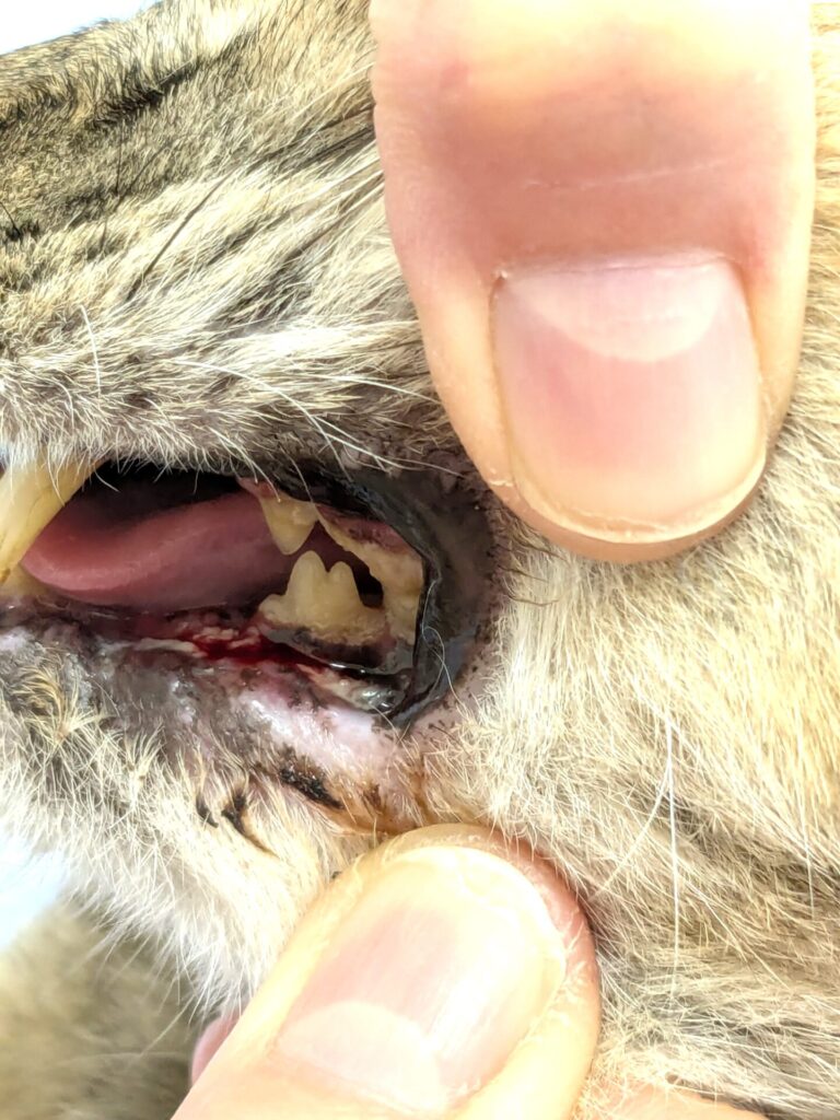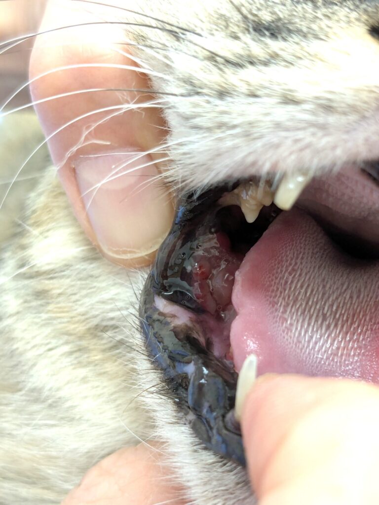 歯茎から下顎骨にかけて、腫瘍らしきものの一部表面?が白く見え、すでに出血も起きている。