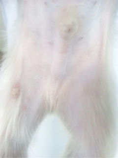 約1~2cm大のかさぶたや皮膚炎が全身に拡がっています。