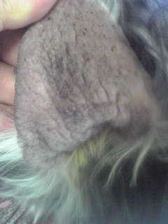 外耳炎が 長く続いて像の皮膚のように厚くなってしまったシュナウザーの耳。