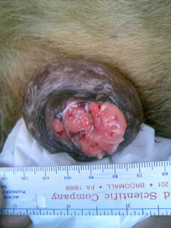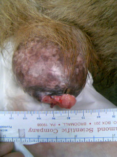 宮崎市、秋田犬、14歳、乳癌(ガン)が大きくなり過ぎて、自潰してしまいました。高齢で、全身状態があまり良くないので、副作用が全く無く、本来動物の持っている自己治癒能力の活性化治療と免疫療法の飲み薬で治療することになりました。